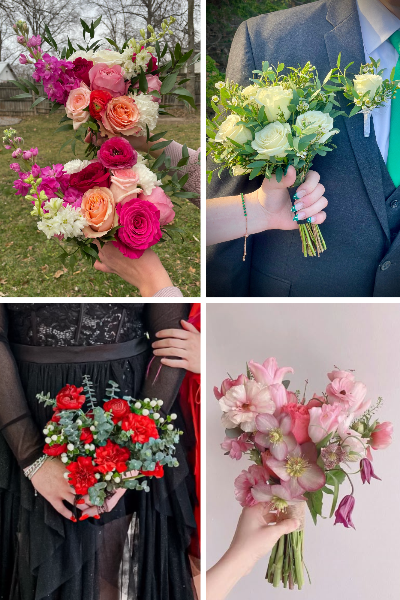Delicate handheld bouquet of floral & greenery wrapped in ribbon with stems exposed. All prom designs are made custom based on the color palette of the student. Please notate your desired colors on the “Request a Delivery” form at the bottom of this page, & I will design it perfectly curated to you!