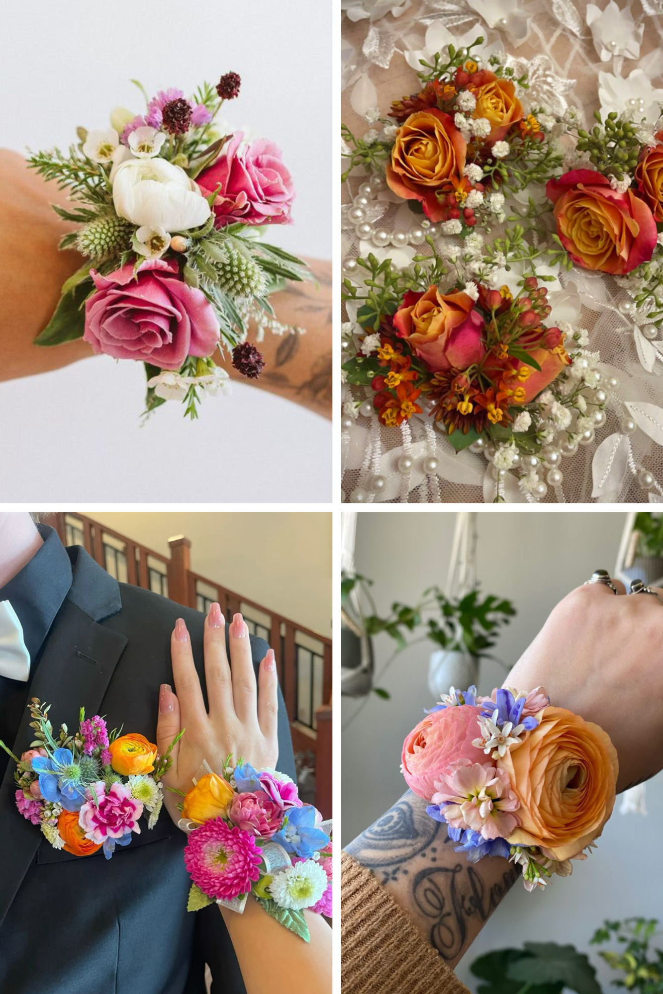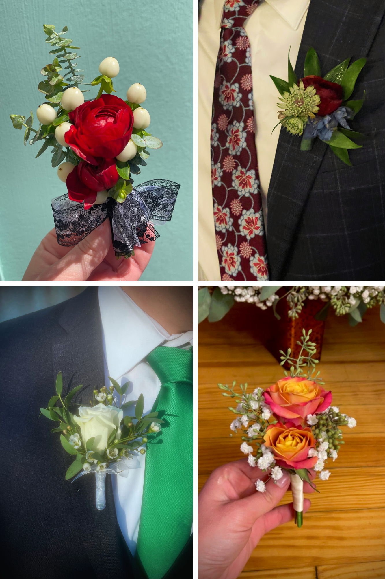 Boutonniere made with floral & greenery wrapped in ribbon with stems exposed, comes with 2 pins for attaching. All prom designs are made custom based on the color palette of the student. Please notate your desired colors on the “Request a Delivery” form at the bottom of this page, & I will design it perfectly curated to you!